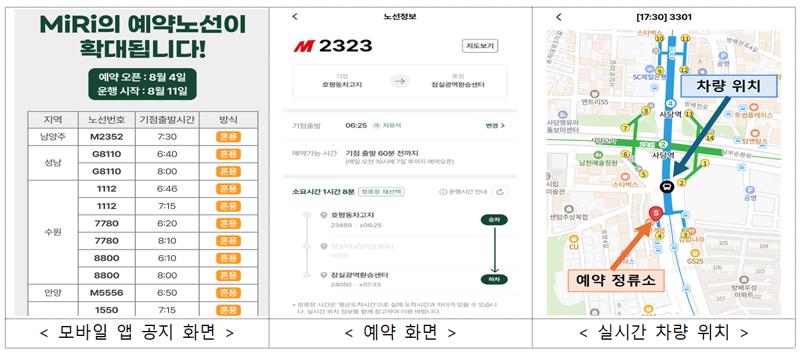 이용자는 MiRi 앱에 교통카드를 등록하고 예치금을 충전한 뒤 원하는 노선과 일시를 선택해 좌석을 예약할 수 있다. 예약자가 우선 탑승하고, 잔여 좌석이 있을 경우 비예약자도 탈 수 있는 혼용제 방식과 예약자만 탑승 가능한 전용제 방식이 병행된다.