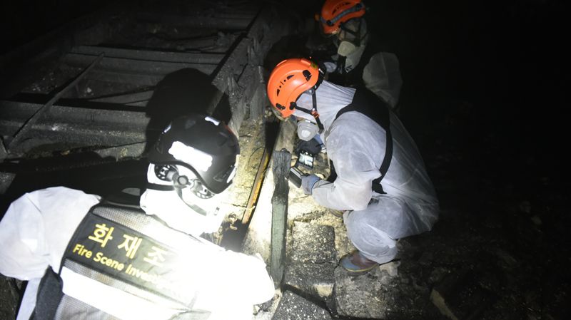 광주광역시 소방안전본부가 여름철 냉방기기 사용량 증가에 따른 멀티콘센트 과부하로 인한 화재가 잇따르고 있다며 각별한 주의를 당부했다. 사진은 화재현장 화재조사 모습. 광주소방안전본부 제공