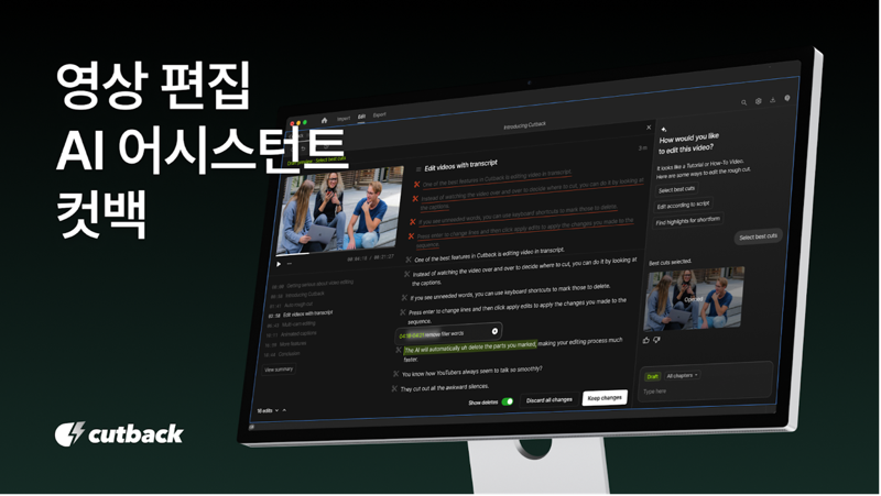 컷백은 전문 영상 편집자를 위한 AI 영상 편집 에이전트다. 원본 영상을 업로드하고 편집 방향을 지정하면 자동으로 초안 컷 편집을 완성한다. 반복 구간 삭제, 자막 생성 및 번역 등 필수 작업도 AI가 자동 처리한다. 어도비 프리미어 프로 등 기존 편집 툴과 연동이 가능해 전문가의 작업 흐름을 유지한 채 도입할 수 있다는 점이 강점이다.