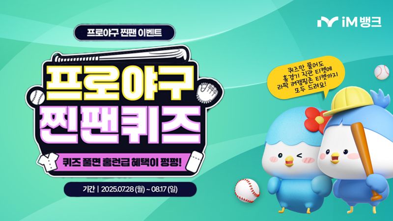 이 이벤트는 8월 17일까지 참여 가능하며, 신규·기존 고객 구별없이 iM뱅크 앱에 접속해 이벤트 페이지에서 야구 퀴즈를 맞히면 자동 응모된다.