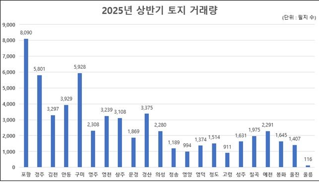 경북도는 올 상반기 도내 토지 5만8271필지(91.7㎢)가 거래됐으며, 작년 하반기(6만510필지) 대비 3.7%(2239필지) 감소했다고 7월 31일 밝혔다.