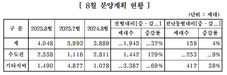 이는 지난달 분양 물량 5993가구보다 1945가구(32%) 감소한 수치다. 전년 동월(3889가구)과 비교하면 159가구(4%) 증가했다.