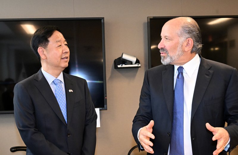 구윤철 경제부총리 겸 기획재정부 장관이 29일(현지시간) 미국 워싱턴D.C. 상무부에서 하워드 러트닉 상무장관과 통상협의 전 대화를 나누고 있다. 기재부 제공 뉴스1