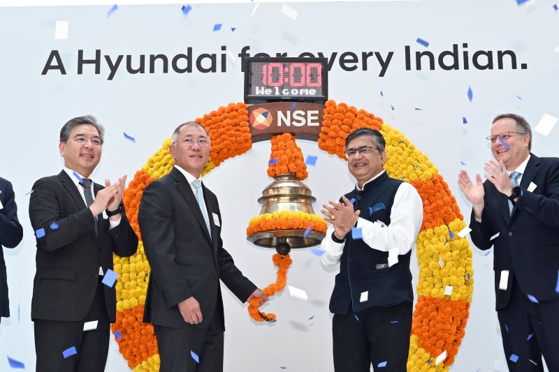 지난해 10월 22일(현지시간) 인도 증권거래소에서 열린 현대차 인도법인 상장식에 참석한 정의선 현대차그룹 회장(왼쪽 둘째)과 장재훈 현대차그룹 부회장(왼쪽 첫째)이 현지 관계자들과 타종식을 하는 모습. 현대차그룹 제공