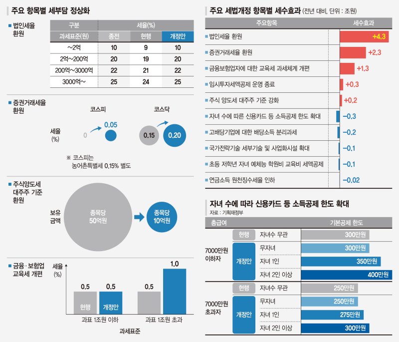 31일 기획재정부가 발표한 '2025년 세제개편안'에는 출산·육아 가구의 세 부담을 덜고, 맞벌이·고령층·저소득층에 대한 세제지원을 확대하는 내용이 담겼다. 우선 자녀 수에 따라 신용카드 소득공제 한도가 상향된다. 현재는 연말정산에서 신용카드 사용액에 대해 총급여 7000만원 이하면 최대 300만원, 7000만원 초과면 최대 250만원까지 공제받을 수 있다.
