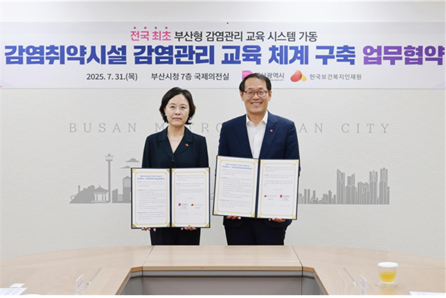 시는 지난달 31일 한국보건복지인재원과 '감염취약시설 감염관리 교육체계 구축'을 위한 업무협약(MOU)을 체결하고, 부산형 감염관리 교육 시스템을 본격 개발·추진한다고 1일 밝혔다.