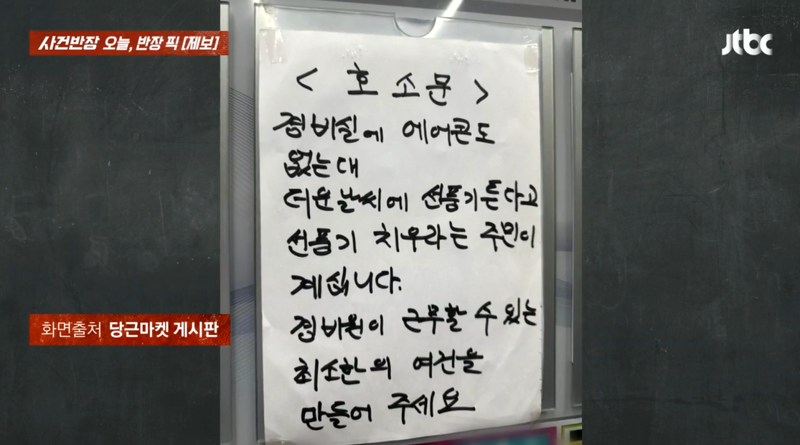 해당 호소문에는 '경비실에 에어컨도 없는데, 선풍기 튼다고 선풍기 치우라는 주민이 있다'며 '더운 날씨에 경비원이 근무할 수 있는 최소한의 여건을 만들어 달라'는 내용이 담겨있다. 이는 해당 아파트 경비원이 작성한 것으로 추정된다.