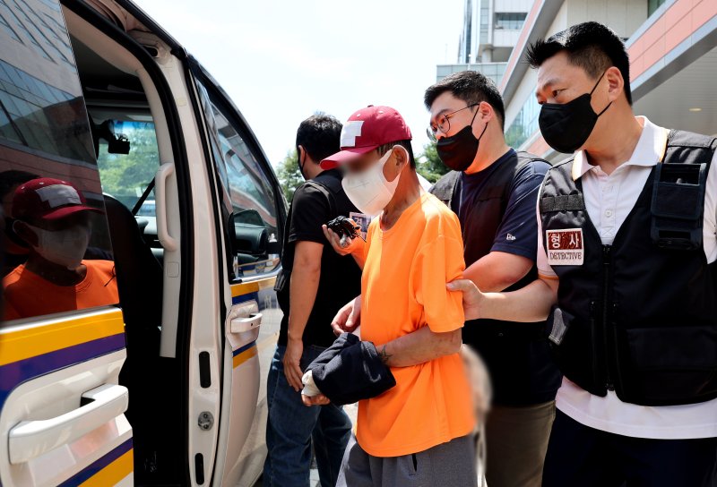 2일 서울 양천구 서울남부지방법원에서 열리는 구속 전 피의자심문(영장실질심사)을 받기 위해 동거하던 50대 여성을 살해한 혐의를 받는 60대 남성 김모씨가 서울 금천경찰서를 나서고 있다. 뉴시스
