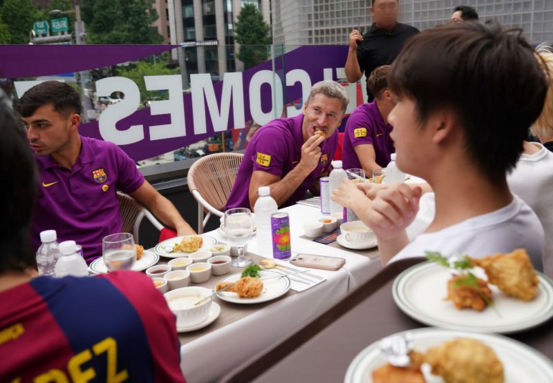 지난 1일 제너시스BBQ그룹이 서울 청계광장 BBQ 빌리지에서 진행한 팬사인회에서 FC바르셀로나 페르디, 레반도프스키(왼쪽부터) 등 주요 선수들이 BBQ 치마카세의 메뉴들을 시식해 보고 있다. 앞서, BBQ그룹의 후원으로 지난 달 31일 FC바르셀로나와 FC서울의 이벤트 축구 경기가 서울 상암월드컵경기장에서 열렸다. BBQ 제공
