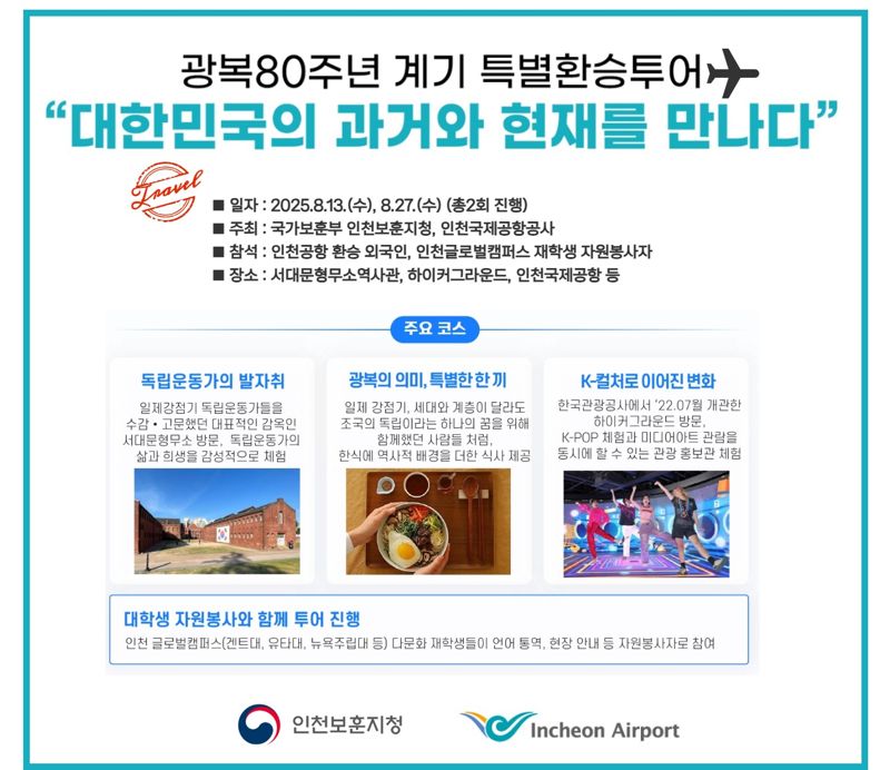 【파이낸셜뉴스 인천=한갑수 기자】 국가보훈부 인천보훈지청은 광복 80주년을 기념해 인천국제공항 외국인 환승객을 대상으로 대한민국의 역사와 문화를 체험할 수 있는 특별환승투어인 ‘대한민국의 과거와 현재를 만나다’를 오는 13일과 27일 총 2회 운영한다고 4일 밝혔다.