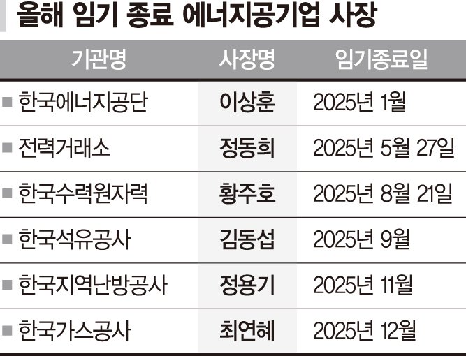 정용기 한국지역난방공사 사장과 최연혜 한국가스공사 사장도 각각 11월과 12월에 임기를 마무리할 예정이다. 이들 기관은 기후에너지부 신설 등 정부 조직 개편과 맞물려 정책 변화의 중심에 서 있다.