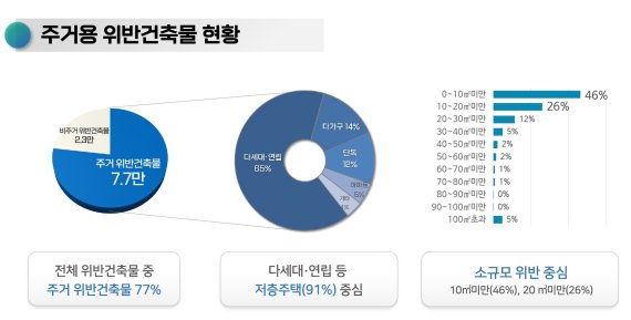 전체 위반 건축물 중 주거 위반건축물은 7만7000여개로 77%이며 이 중 저층주택이 91%를 차지하는 것으로 나타났다.