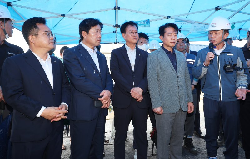 6일 더불어민주당 을지로위원회 민병덕 위원장과 위원들이 지난 4일 작업자가 중상을 입고 의식불명에 빠진 사고가 발생한 경기도 광명시 포스코이앤씨 고속도로 건설공사 현장을 찾아 송치영 포스코이앤씨 사장의 설명을 듣고 있다. 연합뉴스