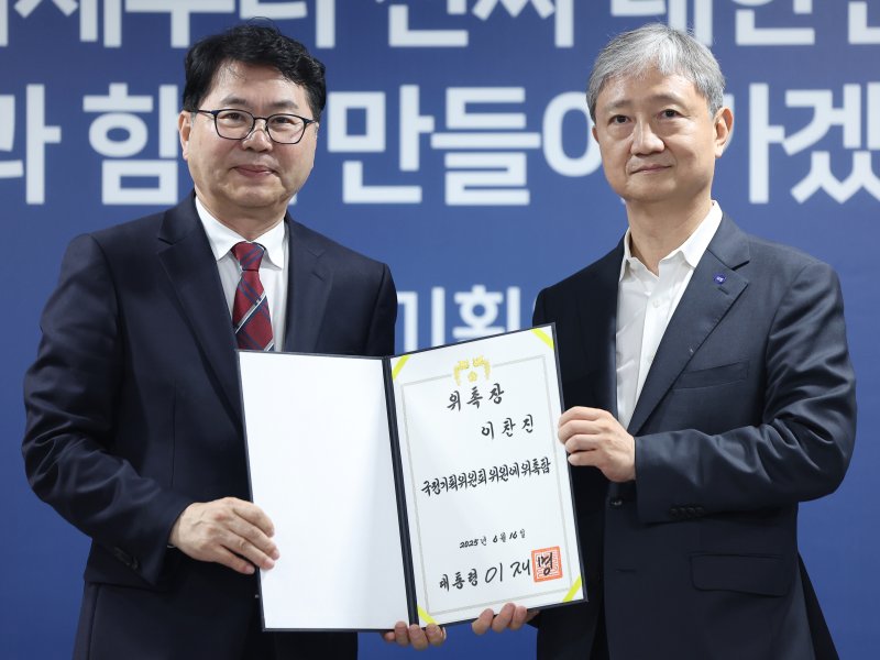 이한주 국정기획위원회 위원장(왼쪽)이 16일 서울 종로구 정부서울청사 창성동 별관에서 열린 출범식에서 사회1분과장을 맡은 이찬진 제일합동법률사무소 변호사에게 위촉장을 수여한 뒤 기념촬영을 하고 있다. (공동취재) 2025.6.16/뉴스1 ⓒ News1 신웅수 기자 (서울=뉴스1) 김근욱 기자 = 이재명 정부 초대 금융감독원장에 이찬진 변호사가 전격 발탁되면서 금융당국 내부가 술렁이고 있다. 새 금융위원장으로 지명된 이억원 전 기획재정부 1차관이 예상 가능한 '관료 출신' 인사인 데 비해, 이 변호사는 금감원 역사상 전례 없는 '변호사 출신'이기 때문이다.