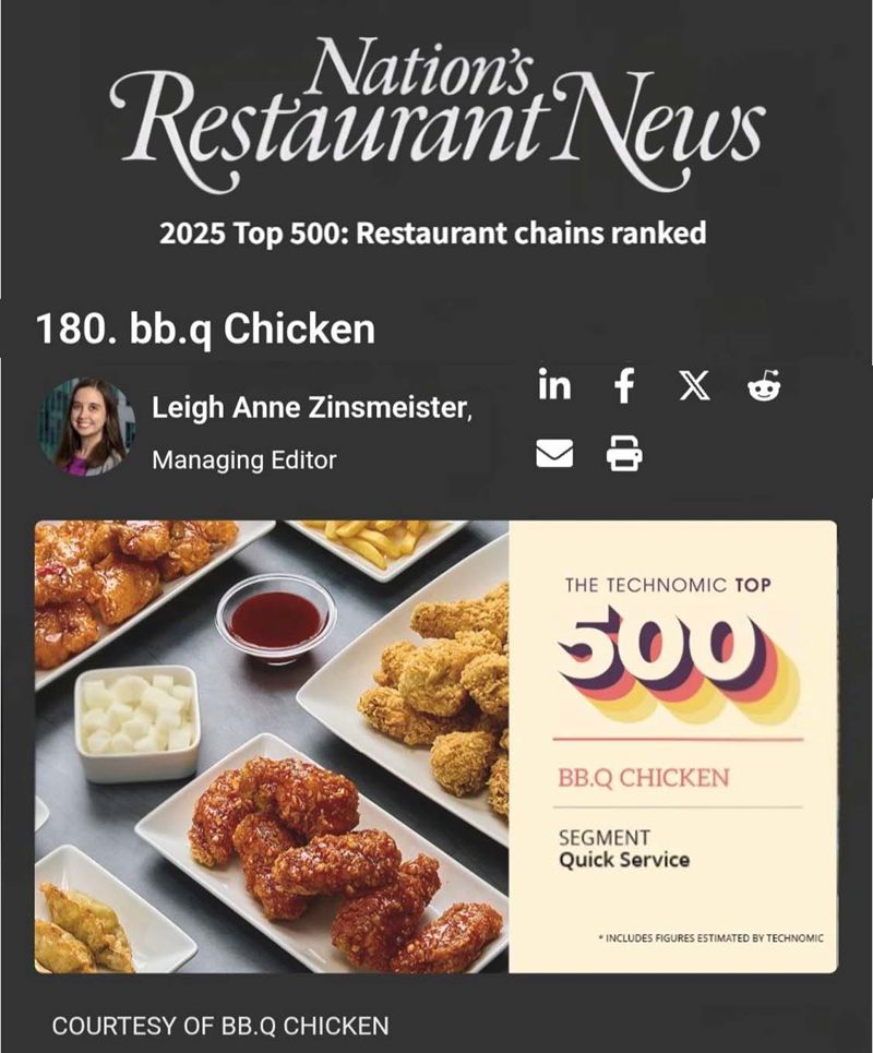 단기간 내 순위 상승뿐 아니라, 지속적인 브랜드 성장과 미국 시장 내 안착이 이어지고 있다는 점에서 더욱 의미 있는 결과로 평가된다. BBQ 관계자는 "앞으로도 글로벌 시장에서의 경쟁력을 바탕으로 K푸드를 대표하는 글로벌 외식 브랜드로 성장하겠다"고 말했다.