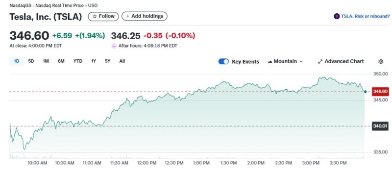 25일(현지 시각) 뉴욕증시에서 테슬라는 1.94% 상승한 346.60달러를 기록했다. 이로써 시총도 1조1180억달러로 늘었다.