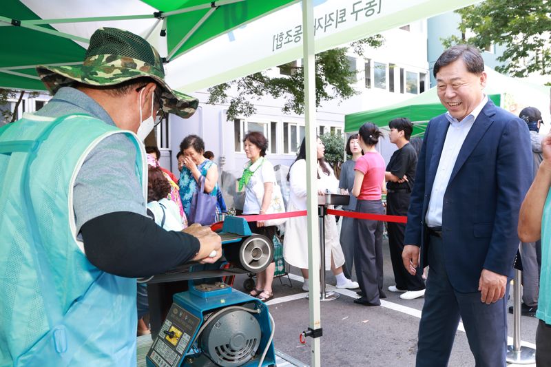 3일 울산 동구 화정주공아파트 일원에서 화정동 OK생활민원 현장서비스의 날이 열린 가운데 김종훈 동구청장이 참여 자원봉사자들을 격려하고 있다. 울산 동구 제공