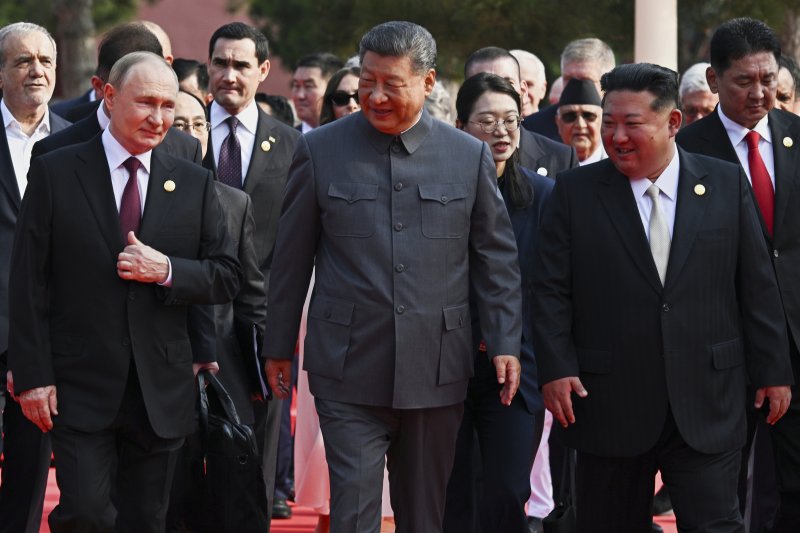 [베이징=AP/뉴시스] 시진핑(가운데) 중국 국가주석이 블라디미르 푸틴(왼쪽) 러시아 대통령, 김정은 북한 국무위원장과 함께 3일(현지 시간) '중국 인민 항일 전쟁 및 세계 반파시스트 전쟁 승리(전승절)' 80주년 기념 열병식이 열리는 베이징 톈안먼 광장으로 걸어오고 있다. 2025.09.03. [서울=뉴시스] 문예성 기자 = 중국 항일전쟁 및 세계 반파시스트 전쟁 승전 80주년(전승절) 열병식을 계기로 북·중·러 정상이 한자리에 모였지만, 관심을 모았던 3자 정상회담은 열리지 않았다. 이를 두고 시진핑 중국 국가주석이 북러 밀착에 불편한 시각을 보이며, 미국과의 관계를 의식한 결과라는 분석이 제기됐다.