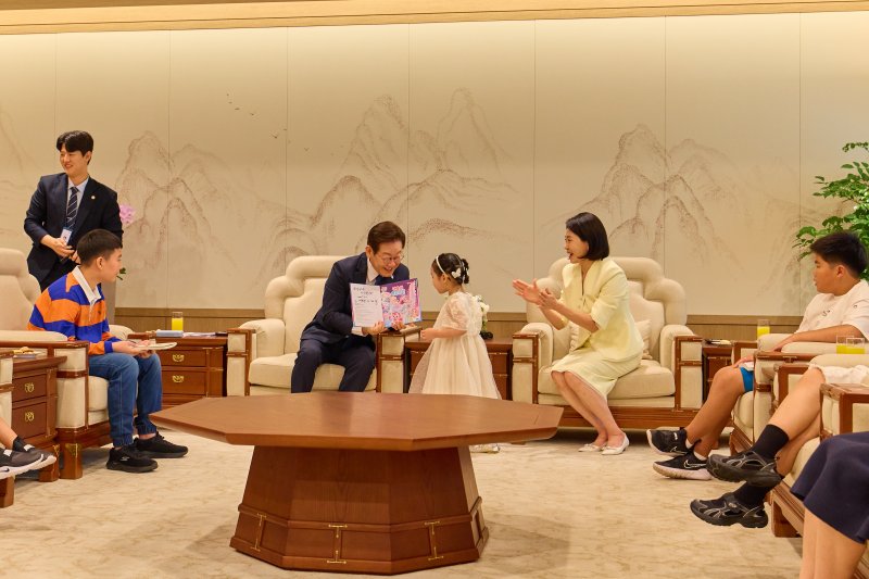 이재명 대통령이 지난 4일 서울 용산 대통령실 청사에서 열린 어린이 초청 행사에서 참석자에게 사인이 담긴 책을 선물하고 있다. 뉴스1