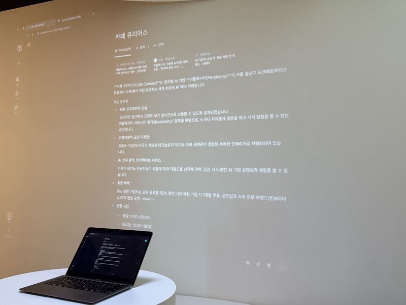 13일 업계에 따르면 AI 기업이 직접 카페를 운영하는 전세계 최초의 시도인 카페 큐리어스는 자사의 AI 서비스 이용자를 위한 공간 마련과 홍보를 위한 브랜딩 등에 초점을 맞췄다. 'Stay Curious(호기심을 유지하라)' 슬로건 아래 꾸며진 공간은 프로 구독자에게 50% 음료 할인을 제공한다. 매장은 장기적으로 운영될 예정이고, '어제의 호기심이 오늘의 질문으로, 오늘의 질문이 내일의 지식으로 연결된다'는 퍼플렉시티의 철학에 맞춰 구현해 낸 공간 디자인이 특징이다.