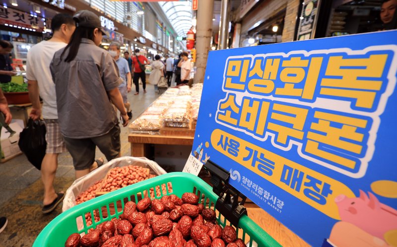 사진은 9일 서울 동대문구 청량리 전통시장에 부착된 민생회복 소비쿠폰 사용가능 점포 안내문. 2025.9.9/뉴스1 ⓒ News1 김진환 기자