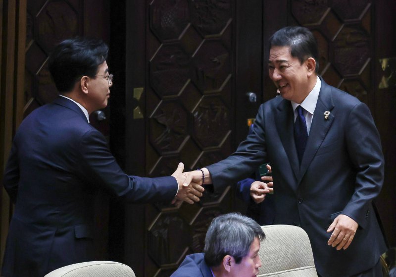 송언석 국민의힘 원내대표가 지난 10일 서울 여의도 국회에서 열린 제249회국회(정기회) 제3차 본회의에서 교섭단체 대표연설을 하기 위해 이동하던 중 김병기 더불어민주당 원내대표와 악수하고 있다. 뉴시스