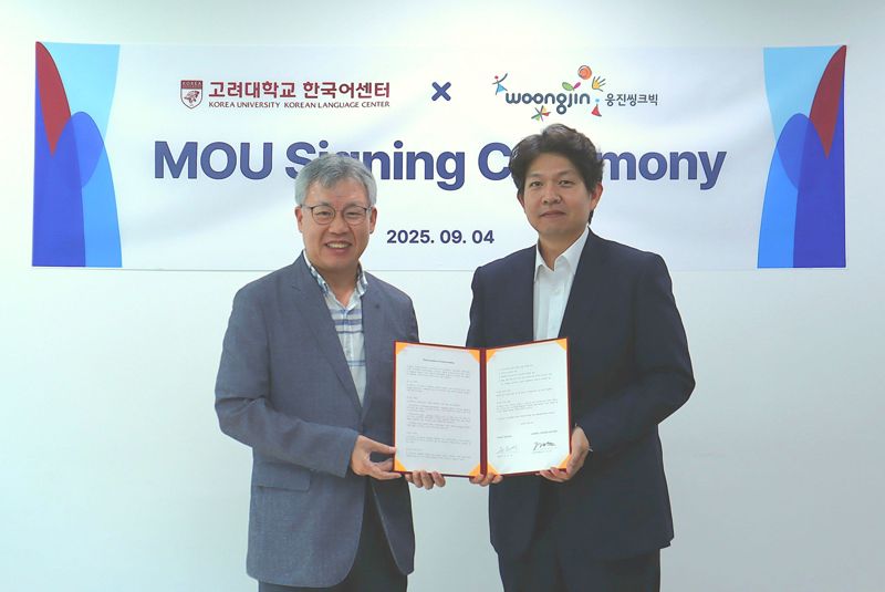 지난 4일 고려대학교 국제어학원 한국어센터 진행된 업무협약 체결식에서 김일경 웅진씽크빅 DGP사업본부장(오른쪽)과 김준연 고려대학교 국제어학원 한국어센터 국제어학원장이 기념 촬영을 하고 있다. 웅진그룹 제공