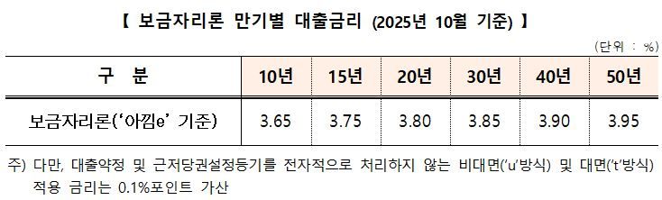 만기별로 보면 10년(3.65%), 15년(3.75%), 20년(3.80%), 30년(3.85%), 40년(3.90%), 50년(3.95%) 등으로 구분된다.