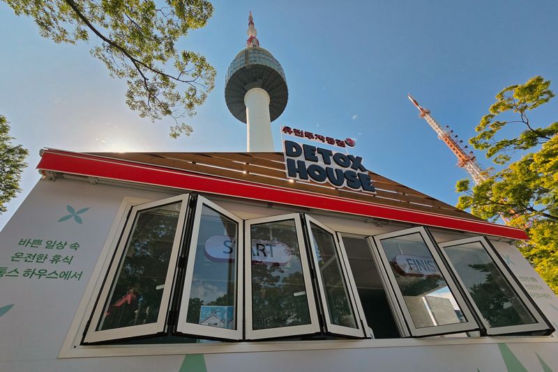 유진투자증권이 남산 서울타워 광장에서 다음 달 26일까지 한 달간 디지털 디톡스 콘셉트의 브랜드 팝업 공간 ‘디톡스 하우스(Detox House)’를 운영한다. 남산 서울타워 광장에 위치한 팝업 및 릴랙스존 전경. 유진투자증권 제공