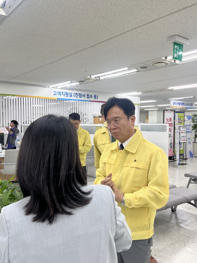 김영훈 고용노동부 장관이 29일 오후 제4차 비상대응본부 회의 이후 서울고용노동청 민원 접수 현장을 찾아 상황을 점검하고 있다. 고용노동부 제공