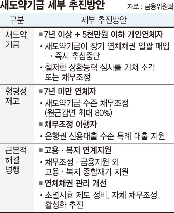금융위는 아울러 고용·복지 종합재기 지원 노력을 병행하고, 장기 연체자 발생이 근본적으로 억제될 수 있도록 소멸시효 제도 정비 및 자체 채무조정 활성화를 포함한 종합 개선방안을 연내 발표할 계획이다. 금융권의 업권별 분담비율도 정해졌다.