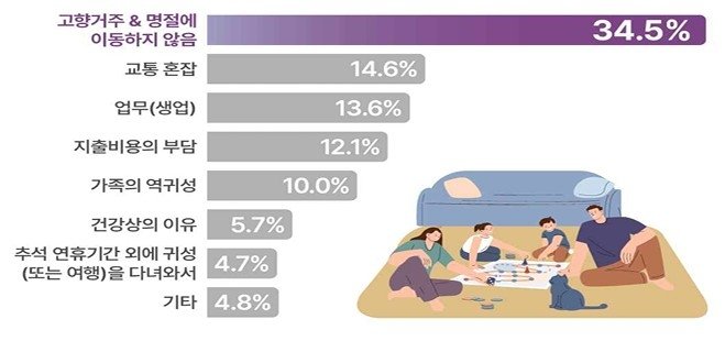 귀성하지 않는 가장 큰 이유는 "고향 거주로 인해 명절에 이동하지 않는다"(34.5%)가 꼽혔다. '교통혼잡'은 14.6%, '업무(생업)' 13.6%, '지출비용 부담'이 12.1%로 뒤를 이었다.
