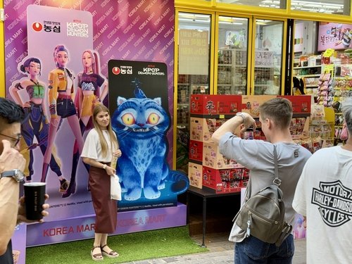 한 외국인 관광객이 농심과 케이팝 데몬 헌터스 협업 홍보물 앞에서 포즈를 취하고 있다. 사진=연합뉴스
