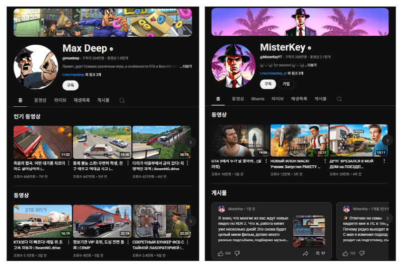 러시아 유튜버 멕스딥(왼쪽)과 미스터키 유튜브 채널 이미지. 이스트소프트 제공