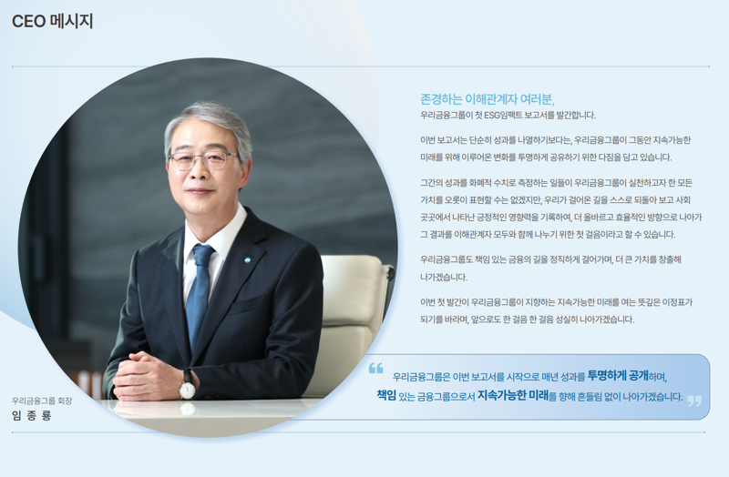 우리금융은 이번 보고서 발간을 계기로 ESG 활동 성과를 신뢰도 높은 데이터로 제시해 글로벌 투자자와의 소통을 강화할 계획이다. 내년부터 측정 범위를 전 계열사로 확대하고, 매년 성과를 공개해 지속가능경영의 투명성을 높여갈 방침이다.