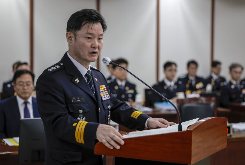 박정보 서울경찰청장이 23일 서울 종로구 서울경찰청에서 열린 국회 행정안전위원회의 서울경찰청에 대한 국정감사에서 인사말을 하고 있다. 뉴시스