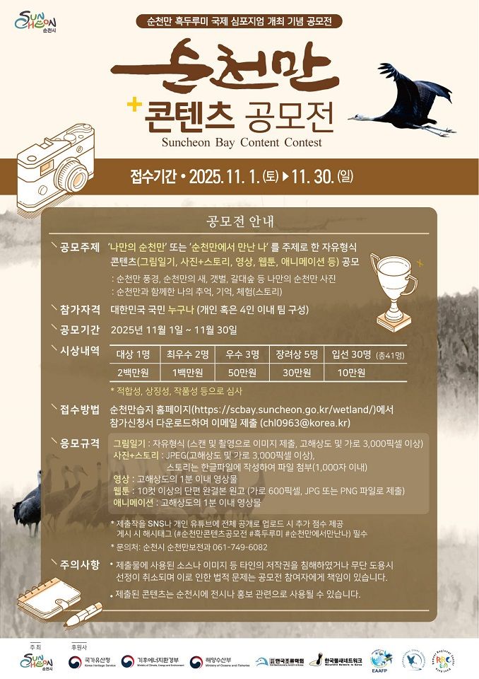 이번 공모전은 탐방객이 바라본 순천만의 자연과 감동의 순간을 창의적인 콘텐츠로 기록하고 공유해 세계가 주목하는 '생태도시 순천'의 가치를 확산하기 위한 것이다.