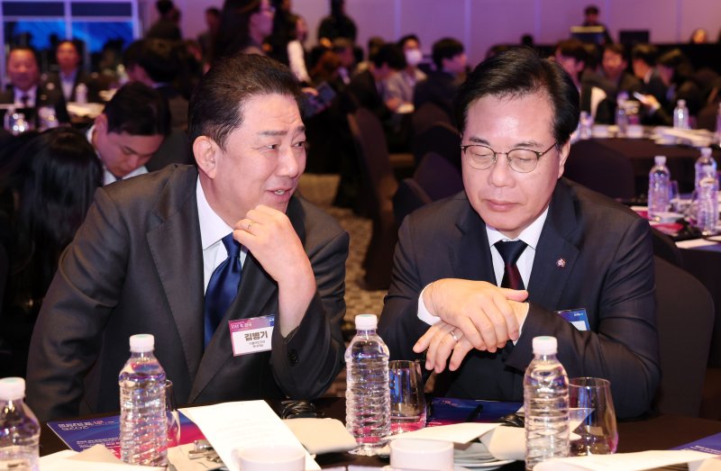 더불어민주당 김병기 원내대표(왼쪽)와 국민의힘 송언석 원내대표가 지난달 20일 서울 용산구 드래곤시티호텔에서 열린 뉴시스 창사 24주년 기념 '10년 후 한국' 포럼에서 대화하고 있다. 연합뉴스