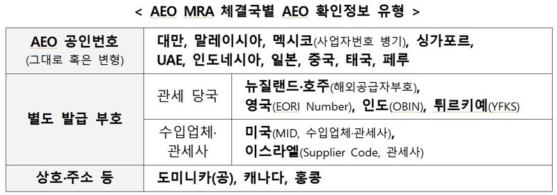 AEO 식별정보는 체결국에 따라 다르며 한국 AEO 공인번호를 그대로 혹은 일부 변형해서 기재하는 경우 현지 관세 당국 혹은 수입업체·관세사가 발급한 별도의 부호를 기재하는 경우 등이 있다.