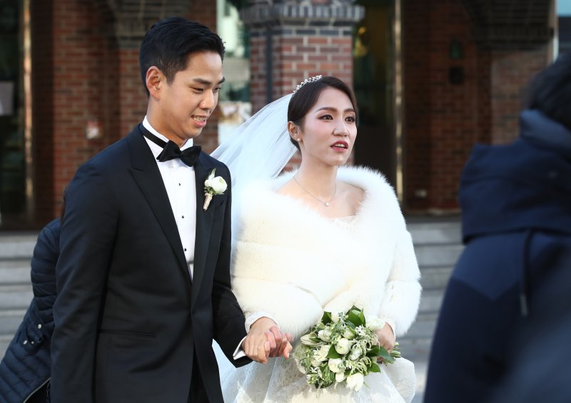 지난 2022년 12월 여자 골프 세계랭킹 1위 리디아 고와 정태영 현대카드 부회장의 아들 정준씨가 30일 서울 중구 명동성당에서 결혼식장으로 향하고 있다. /사진=뉴스1