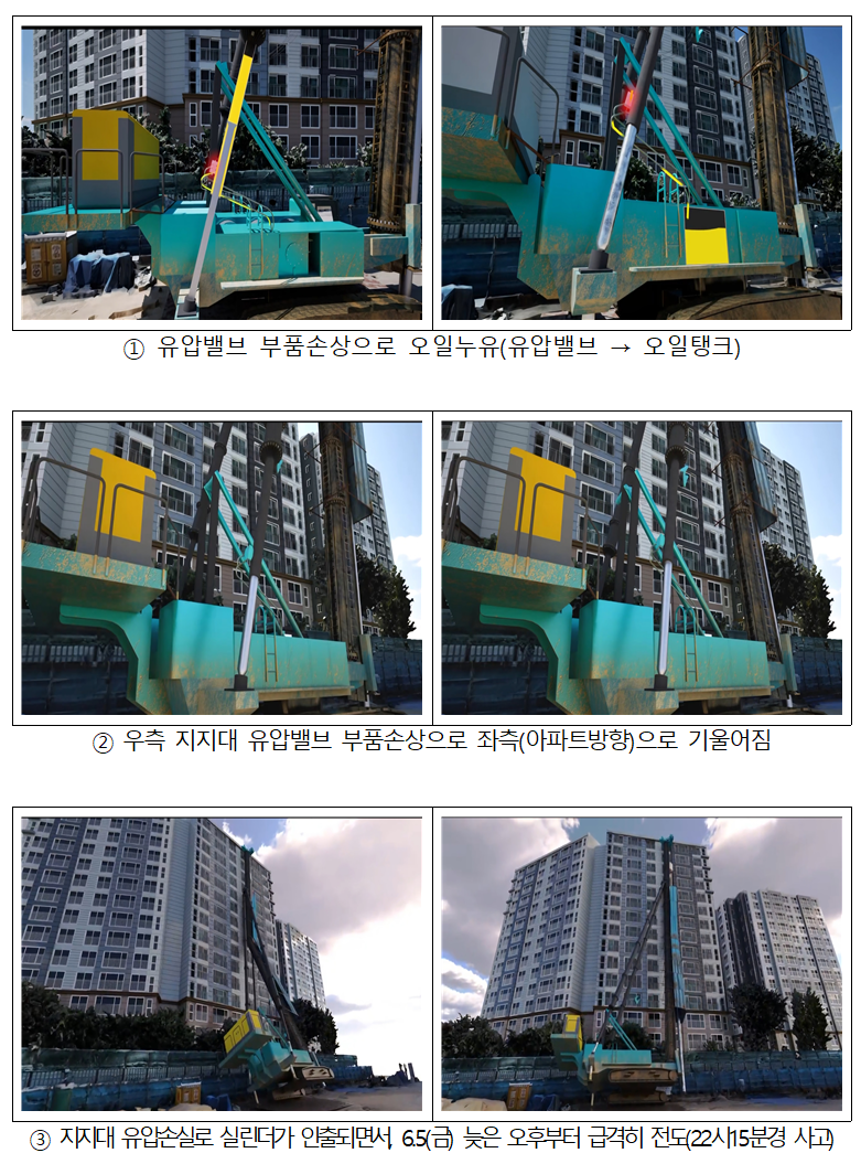 조사단은 지난 6월부터 약 5개월간 현장조사 및 시험 10회, 관계자 청문 5회, 외부전문가 및 내부 검토회의 15회 등 30여 차례 조사 활동을 수행했다. 항타기 백스테이(지지대) 유압밸브 분해 및 성능 비교시험, 작업 대기 과정에서 지지대 실린더의 길이 변화 분석 등을 외부 전문기관에 의뢰해 정밀 검증을 진행하는 등 원인 규명에 집중했다.
