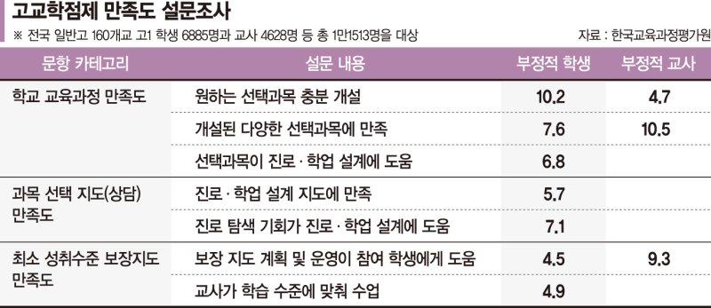 이 자료에 따르면 학생들은 '희망하는 과목을 자유롭게 선택할 수 있다'는 점에 대해서는 4.3%만이 부정적이었고, 교사들은 공동교육과정 등 학교 밖 교육을 통한 과목 선택 기회 제공에 1.9%만이 부정적 응답을 보여 상대적으로 긍정적인 평가를 했다.