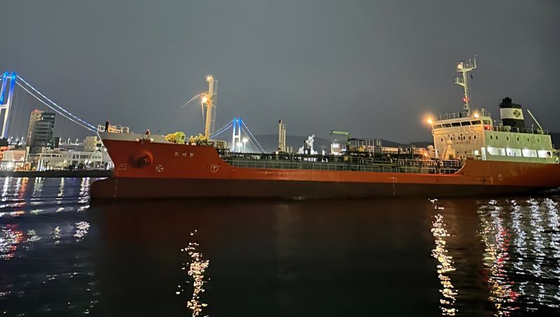 (주)아시아에너지 온산공장에서 제조한 바이오중유를 가득 실은 선박이 울산항을 출항하고 있다. (주)아시아에너지 제공