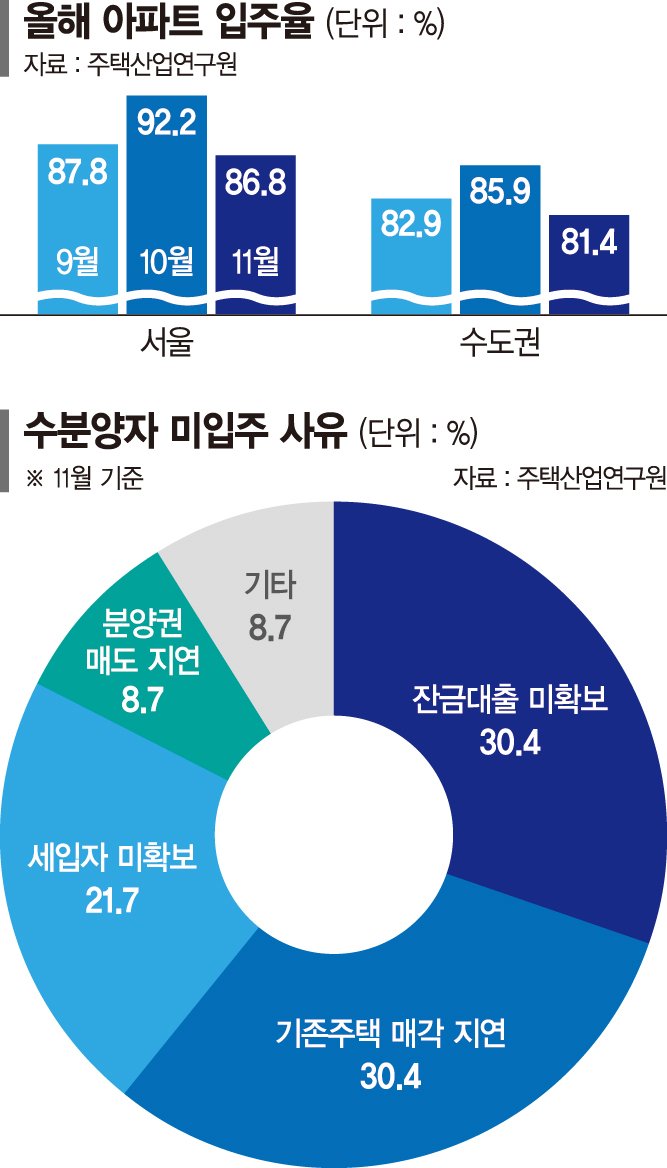 이 같은 대책으로 기존 주택 매도도 쉽지 않으면서 수도권 전역 새 아파트 입주율도 하락하고 있다. 주택산업연구원 조사에 따르면 지난 11월 서울 아파트 입주율은 86.8%로 10월(92.2%) 대비 크게 하락했다. 수도권도 10월 85.9%에서 11월 81.4%로 떨어졌다. 미입주 원인은 잔금대출 미확보(30.4%)와 기존주택 매각지연(30.4%) 등이다. 노희순 주산연 연구위원은 "강력한 대출규제 등의 영향으로 수도권을 중심으로 입주전망이 하락하고 있다"고 전했다.