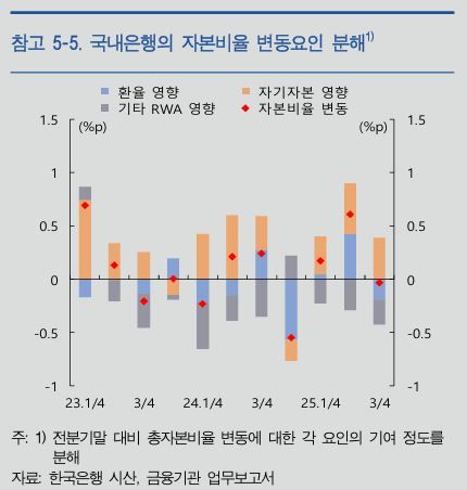 23일 한은이 발표한 ‘2025년 하반기 금융안정보고서’에 따르면 지난 3·4분기 환율 요인이 국내은행 자본비율을 전분기 말 대비 0.2%p 하락시킨 것으로 나타났다. 한은 관계자는 “환율 상승 폭이 컸던 지난해 4·4분기 중에도 은행의 자본비율이 큰 폭으로 내린 바 있는데, 환율 기여도가 상당한 것으로 추정됐다”고 설명했다.