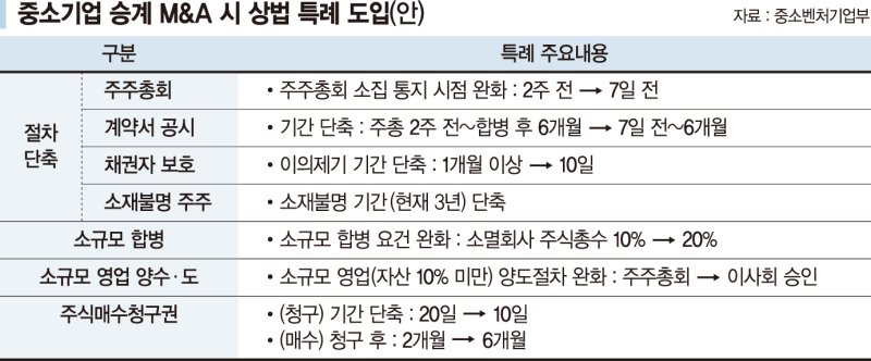 이 밖에 중기부는 중소기업 승계 목적 M&A의 경우 절차를 효율화할 수 있도록 상법에 대한 특례 규정을 특별법에 도입한다.