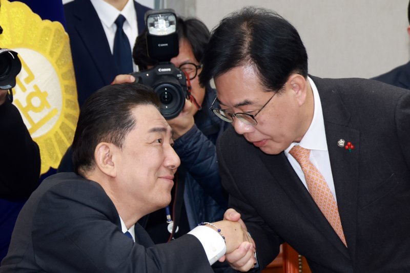 [서울=뉴시스] 고승민 기자 = 김병기 국회 운영위원장과 송언석 국민의힘 원내대표가 18일 서울 여의도 국회에서 열린 운영위원회 전체회의에서 인사를 하고 있다. 2025.12.18. kkssmm99@newsis.com [서울=뉴시스]김지훈 한은진 기자 = 통일교 정치권 금품 로비 의혹 특검을 위한 여야 협의가 평행선을 달리고 있다. 특검 후보 추천 방식, 수사 범위 등을 놓고 입장차를 좁히지 못하고 있다. 국민의힘과 개혁신당은 특검 법안을 공동 발의하는 등 대여(對與) 공동 전선을 구축해 압박에 나선 모습이다.