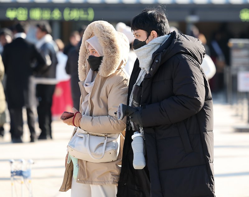 서울과 경기에 한파주의보가 내려진 25일 서울 종로구 경복궁을 찾은 외국인 관광객이 강추위에 목도리 등 방한용품을 두른채 이동하고 있다. 기상청은 전국이 대체로 맑겠으나 북쪽에서 내려온 찬 공기의 영향으로 아침 기온이 전날보다 5도 이상 떨어지며 대체로 춥겠다고 밝혔다. 2025.12.25/뉴스1 ⓒ News1 김진환 기자 (서울=뉴스1) 김종훈 기자 = 25일 저녁 전국 대부분 지역에 한파특보가 발효된다.
