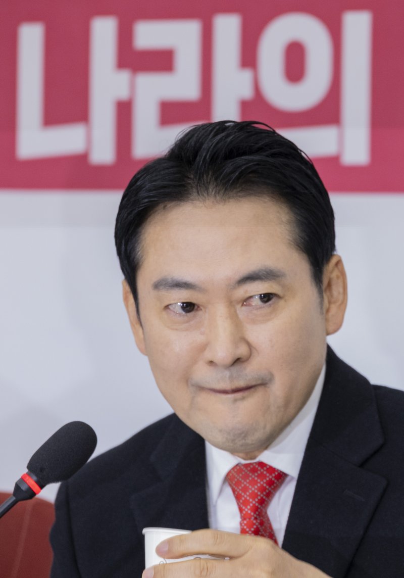 국민의힘 장동혁 대표가 28일 국회에서 열린 기자간담회에서 질문을 받다 물을 마시고 있다. 연합뉴스