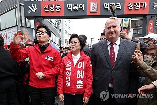 함께 거리인사 나선 한동훈-인요한-이혜훈 /사진=연합뉴스